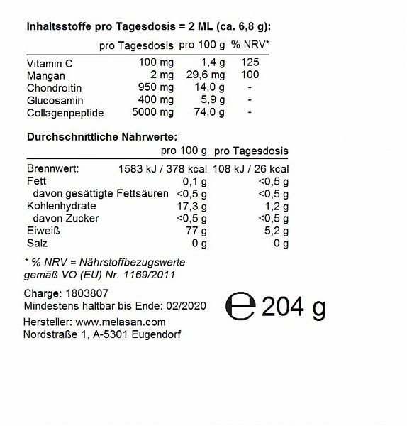 Dieses Produkt enthält Kollagenproteine, Glukosamin, Chondroitin, Mangan und Vitamin C.