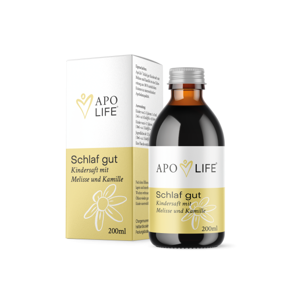 ApoLife® Schlaf gut Kindersaft mit Melisse und Kamille ist eine Zubereitung aus 100 % natürlichen Kräutern in österr. Apothekenqualität.