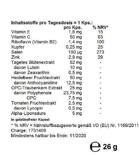 Dieses Produkt enthät Lutein und Zeaxanthin, Anthocyanide der Heidelbeere und OPC des Traubenkerns