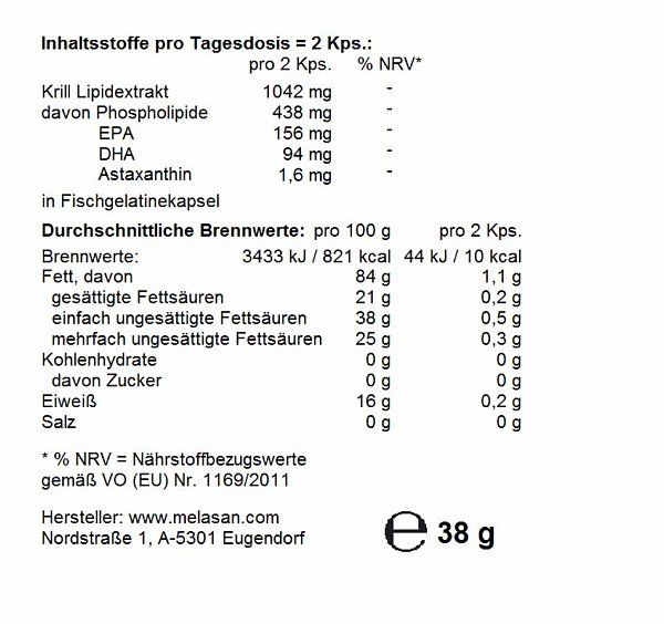 Krill-Öl: 500 mg (enthält 210 mg Phospholipide, 75 mg EPA,
