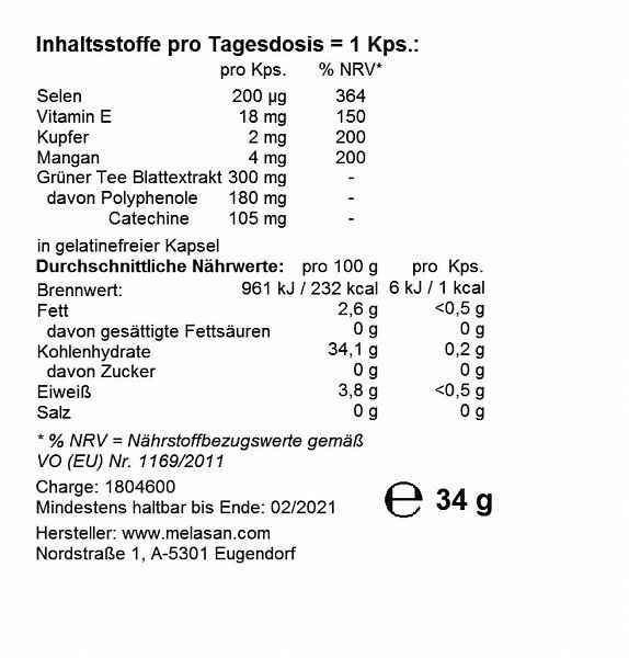 Die empfohlene Tagesmenge nicht überschreiten. Nahrungsergänzungsmittel sind kein Ersatz für eine abwechslungsreiche Ernährung. Nahrungsergänzungsmittel außerhalb der Reichweite von kleinen Kindern lagern.